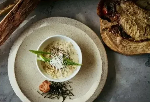 とろろや湯葉を加えた豆乳仕立ての十五穀米粥に、香ばしい焼き魚、梅干し、海苔を添えた朝食限定メニュー。デトックスやヘルシーを意識し、ブッフェでは豆乳出汁と好みのトッピングで楽しめます。