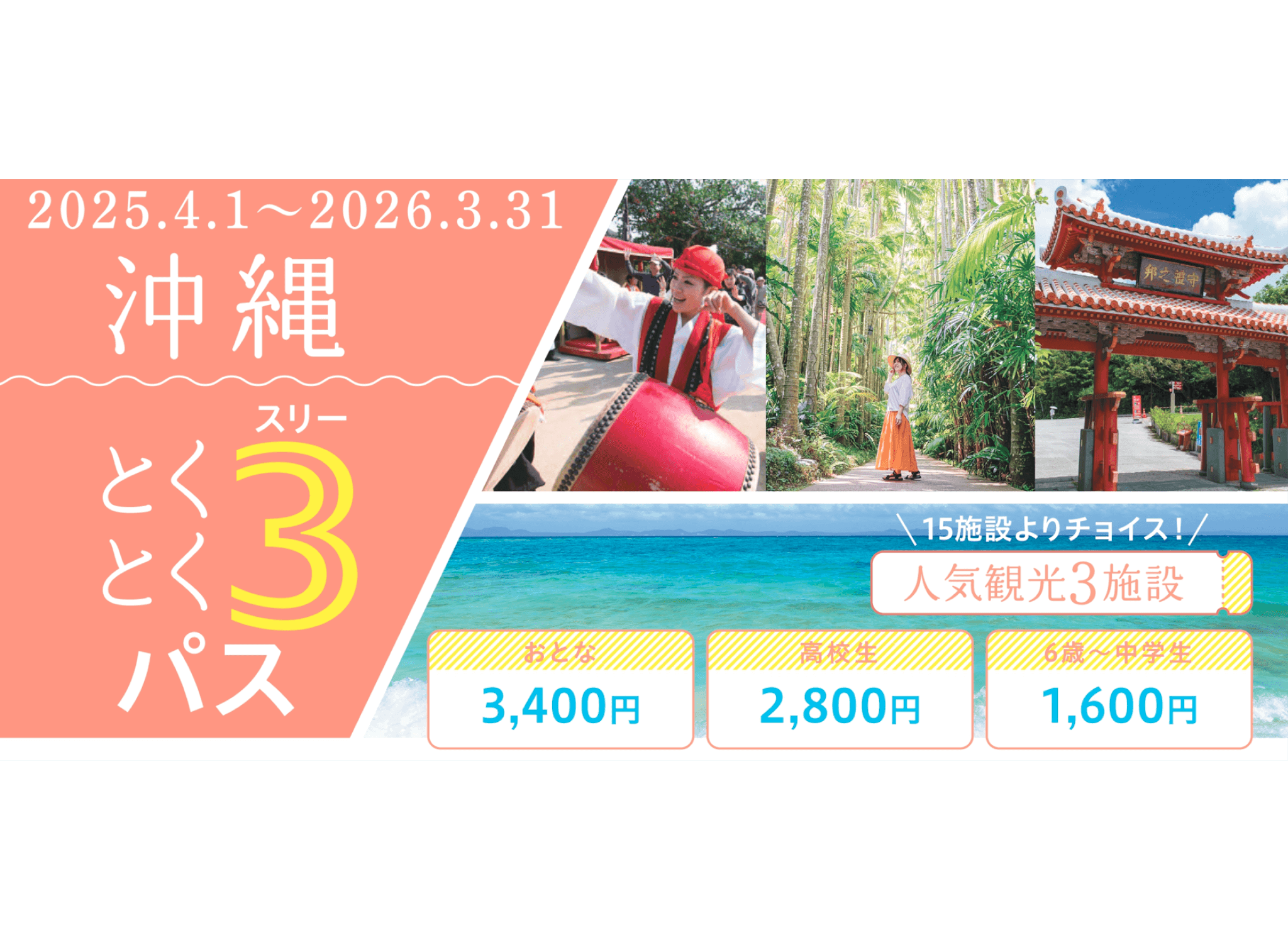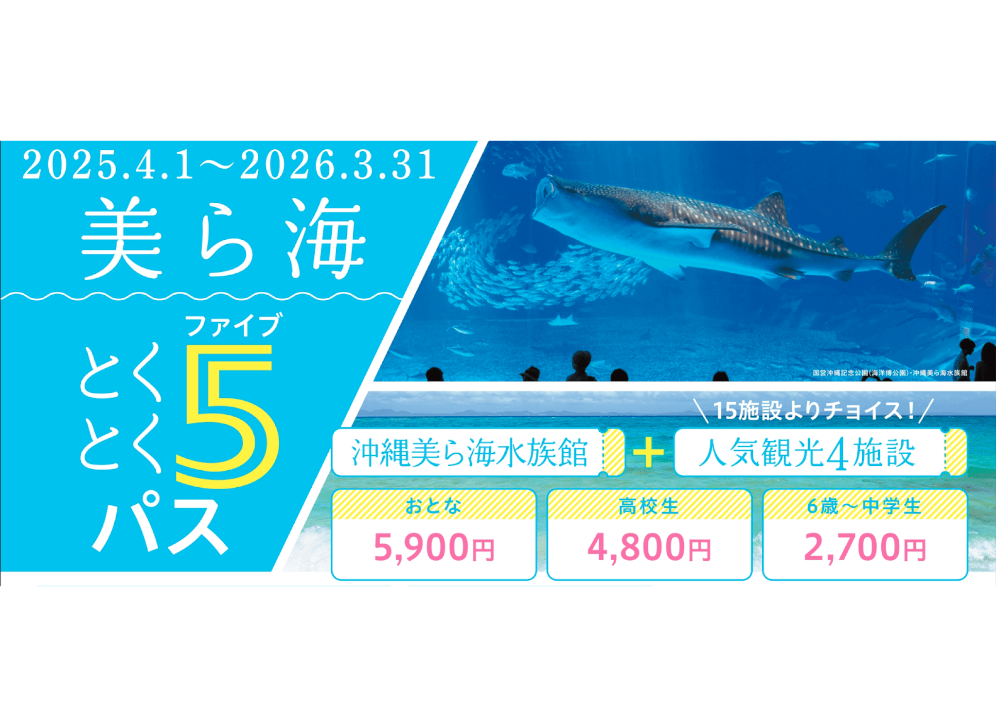 美ら海とくとく5パスは沖縄美ら海水族館と沖縄県内の人気観光スポット4施設に入場でき、沖縄とくとく3パスは沖縄の人気観光スポット15施設の中から3施設にご入場いただけるチケットです。新しい沖縄を発見する旅をお楽しみください!