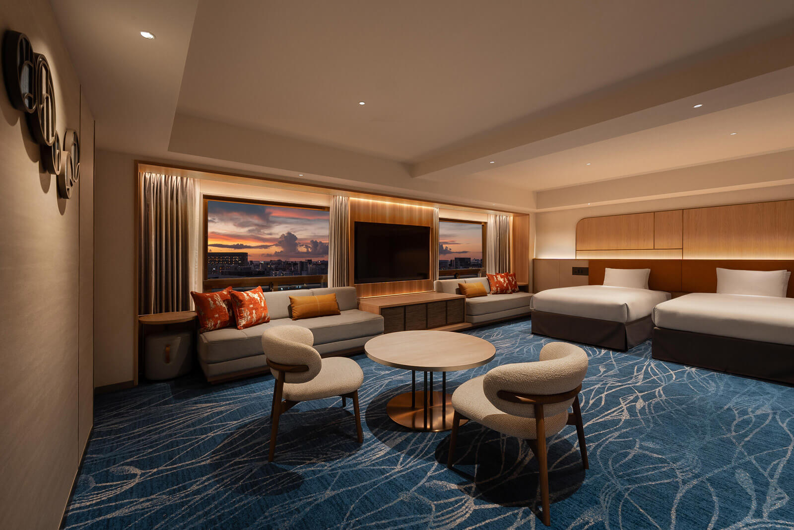 沖縄の歴史を今に伝える琉球藍の色彩を絨毯に織り込み、クラシカルモダンな温もりと調和した意匠。
